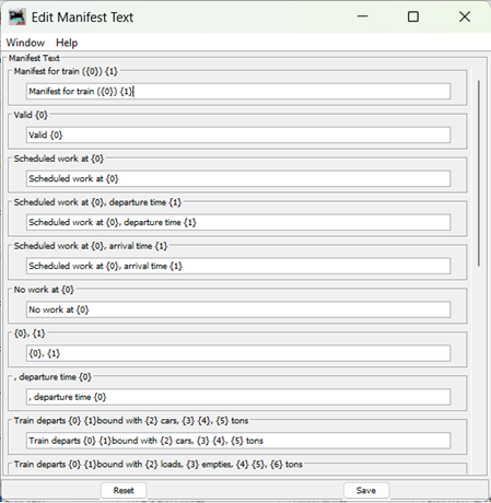 Locations can have spurs, yards, staging and classification/interchange tracks. Spurs are used to service industries, and can optionally have schedules assigned to them which allows for very fine and realistic control over car movement and loads. Trains can be configured to require a caboose or car with Flashing Rear End Device (FRED). The program generates Manifests for each train and switch lists for any location. A switch list for a location shows the work for all of the trains that will visit that location. The program can also place icons representing trains on a JMRI panel. The icon can be taught to move in the panel along with the train from location to location.