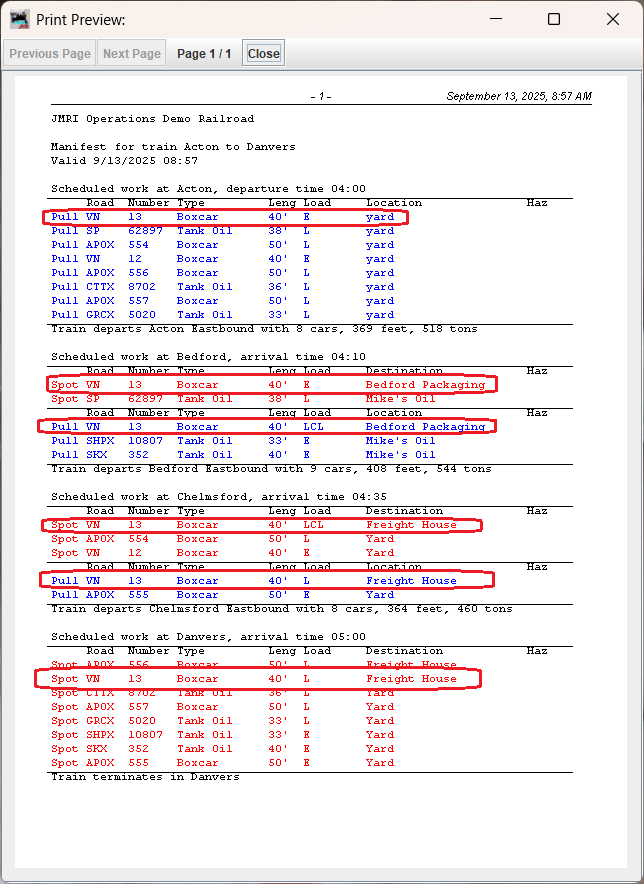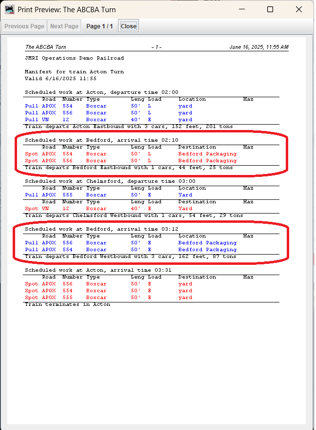 Below is a train Manifest using the "Standard" format, with blue text for car pick ups, and red text for car set outs.