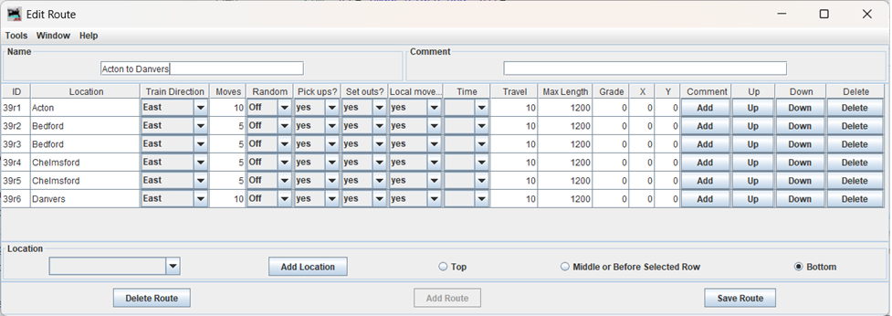 If you keep building your first train and moving it, eventually all of your cars will end up at the last location in your route! Create another route that is the inverse of your first train. Go to the Routes window and under the "Tools" menu select Copy Route. Select your original route, check the "Invert" checkbox, enter a name for this route, and then the "Copy" button. Now create a second train that uses this route to move cars in the opposite direction of your first train.