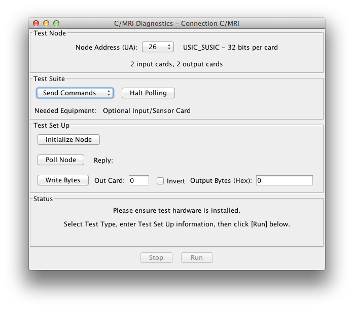 Diagnostics are useful for checking the functioning of your C/MRI hardware. These automated procedures are controlled via a dialog available by selecting Run Diagnostics in the C/MRI menu. Some of the diagnostic tests require external hardware to operate. Chapter 6 of Bruce Chubb's C/MRI User's Manual, Version 3.0, describes a test output card and loopback cable. These items connect to input and output ports on Classic nodes and provide hardware devices which are driven by the diagnostic test code. An integrated test card (IOTEST) from MRCS provides compatible test hardware support.