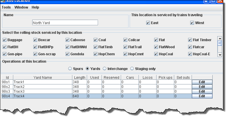 Now after selecting all of the options for the Yard Location, click on and the Add Yard Track window opens.