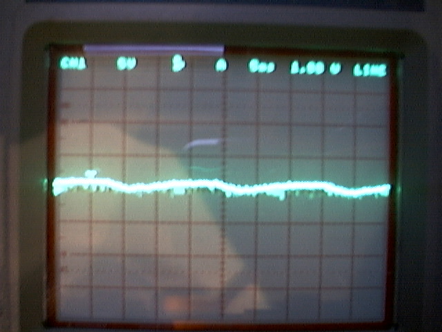 Malheureusement, les photos prises par l'oscilloscope ne sont pas assez sensibles, donc elles montrent beaucoup de flou. Dans tous les tableaux, la référence de masse a été centrée et l'échelle verticale est 5V/division. La portée a été déclenchée en ligne. Seule une trace est montrée