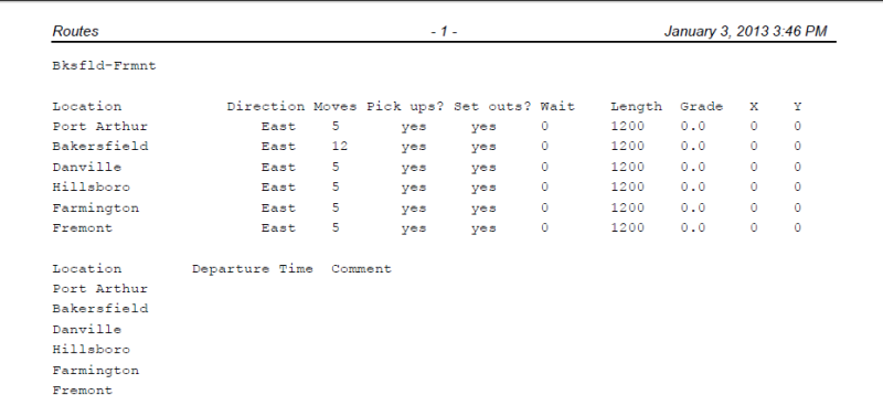 A route is a list of locations that a train will visit. Later you can decide if the train stops at a location for work. Routes can be point to point or out and back. The current Routes are shown in the Routes window with their status, i.e. Orphan means it has not been assigned to a train.