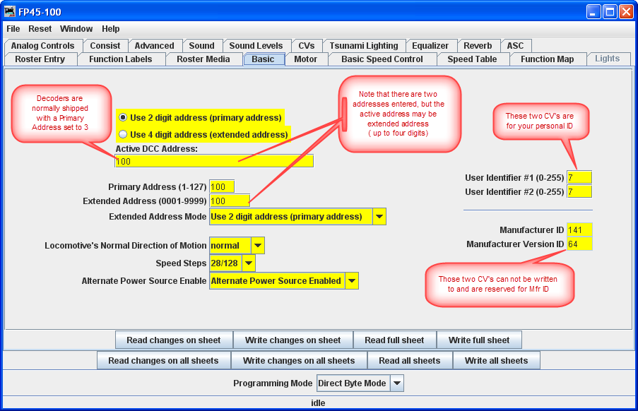 One of the first things you will notice about the expanded Basic Pane in the Comprehensive Programmer is that there are a lot more options than you found in the Basic Programmer. Now use the Read full sheet button to read the values that the locomotive is programmed to. Now you can determine if you want to change any values.