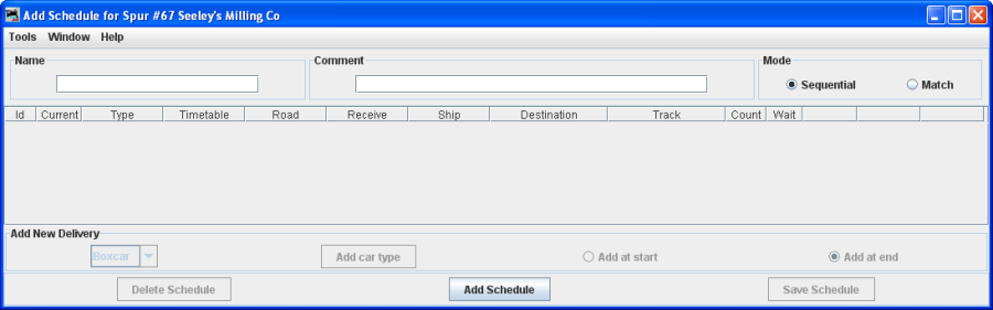 Type a Name for your schedule and then press on the bottom of the panel. Multiple sidings can use the same schedule as long as the sidings use the same car types and roads.