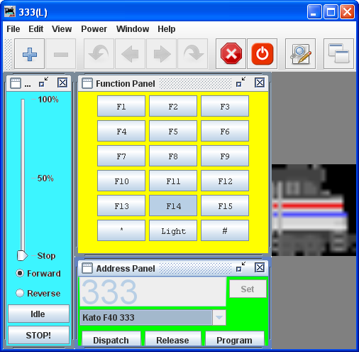 (color shading added to show functional areas throttle panels) The Throttle Window contains Menu Bar, Toolbar and three panels which may be enabled or disabled via check box in the View menu. Each panel has a title bar with windows controls to minimize, maximize and exit: Warning!!! Be careful with the left hand (minimize) buttons. In Windows, if the little guy is clicked it will minimize the panel, which means it is no longer visible but the restore button is lost behind the rest of the panels. The way to easily get it back, is to go into the view menu, uncheck it there, then go back again and re-check it. You may also drag the panels out of the way to uncover the Maximize icon for a minimized panel. Address Panel (green shading) facilitates setting the address of the locomotive you wish to control with the throttle. Control Panel (blue shading) contains the controls for applying power to the locomotive that is addressed and controlling speed Function Panel(yellow shading) contains all the function buttons used to control the addressed locomotives functions. |