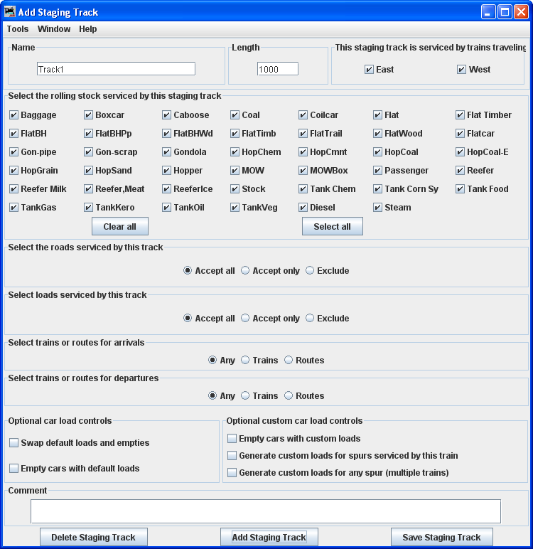 Exclude Accept all rolling stock except from those railroads that are excluded. We will use the default. If you want to edit the roads accepted go to Add Cars then Edit Roads, to add another selection to the drop-down list. Select the loads serviced by this track Accept all Default accepts any load