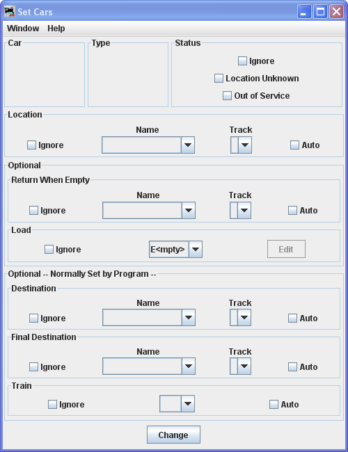 Status Location Unkown results in: program will ignore the car when building a new train; on manifests and switch lists, the program will list the car as misplaced. This selection disables all other selections in this window. Out of Service when selected instructs the program to ignore the car when building new trains. Many operators have a RIP (Repair in Place) track and use this feature to hold the care there until repairs have been completed. Location Use the location set to place the car on the layout. Return When Empty Enter location to return the car to when empty. Auto shows valid track for a given location. Load You may also change the cars load. Optional--Normally Set by Program See window help |